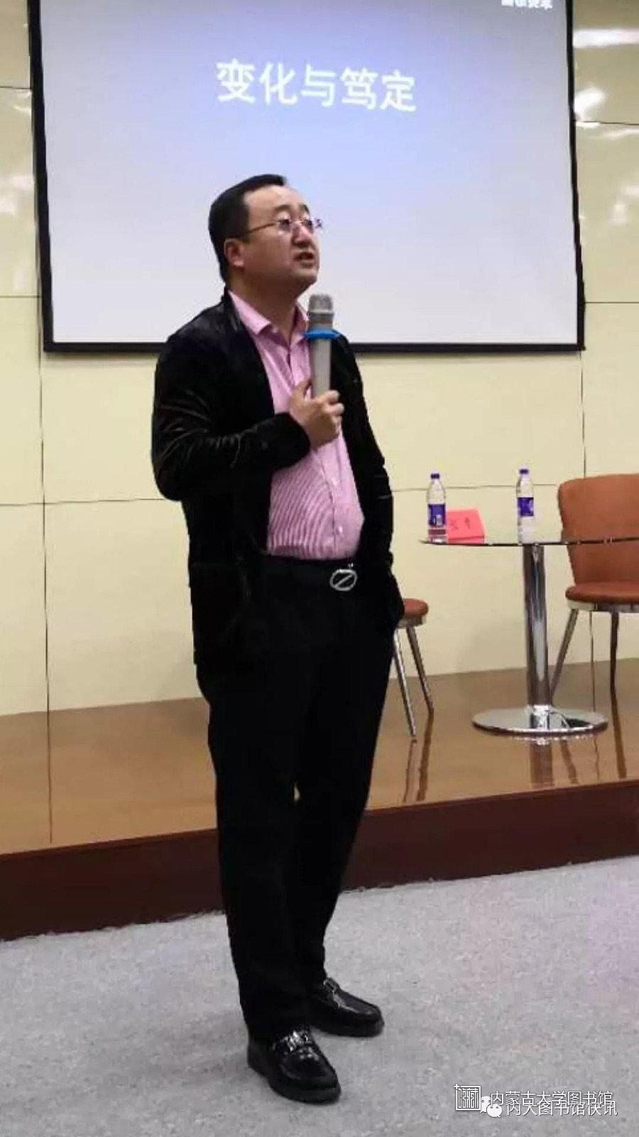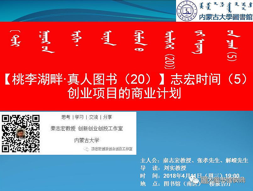 2018年4月11日下午19时,由内蒙古大学图书馆主办、内蒙古大学图书馆读者协会承办的【桃李湖畔·真人图书(20)】志宏时间(5) 秦志宏教授与张孝先生对话在内蒙古大学图书馆(南校区)举行了线下导读分享会。内蒙古大学经济管理学院秦志宏教授对话内蒙古塞北粮仓总裁、内蒙古股权投资行业协会秘书长,赛领资本董事长、创始人,内蒙古大学校友张孝先生,两位就“变化与笃定”这一关键词进行分享。