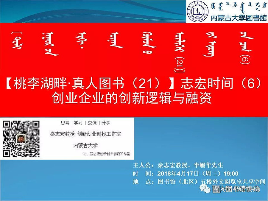 2018年4月17日下午19时,由内蒙古大学图书馆主办、内蒙古大学图书馆读者协会承办的【桃李湖畔·真人图书(21)】志宏时间(6)秦志宏教授与李崛华先生对话在内蒙古大学图书馆(北校区)外文阅览室共享空间举行了线下导读分享会。内蒙古大学经济管理学院秦志宏教授对话同盟投资总裁李崛华先生,两位就“同盟资本投资逻辑介绍”这一主题进行分享。