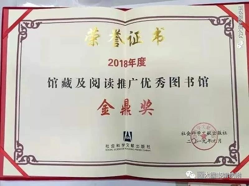 多年来,社科文献出版社出版的图书一直是我馆重点收藏对象。2018年,我馆采购社科文献出版社图书989种2619册。该社的图书已成为内蒙古大学文献资源建设重要的组成部分。今年,社科文献出版社授予内蒙古大学图书馆“馆藏及阅读推广优秀图书馆金鼎奖”。