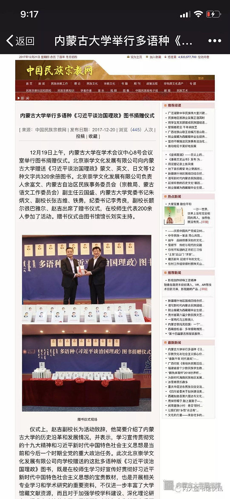 媒体内大 中国民族宗教网:内蒙古大学举行多语种《习近平谈治国理政》图书捐赠仪式 -2