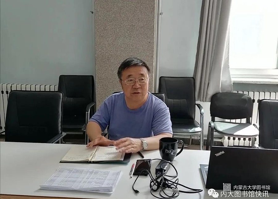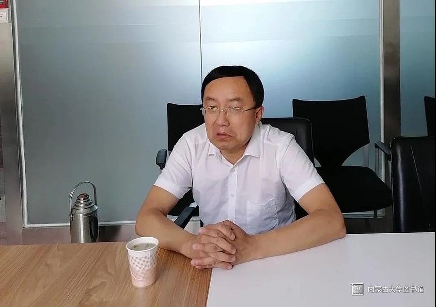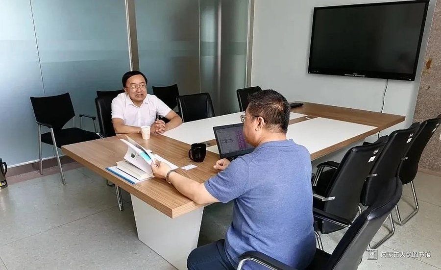 2021年7月8日 9:00,图书馆馆长刘实教授和北京万博书香文化邬震源先生在额布尔扎讨论间座谈。(王琼 摄影报道)