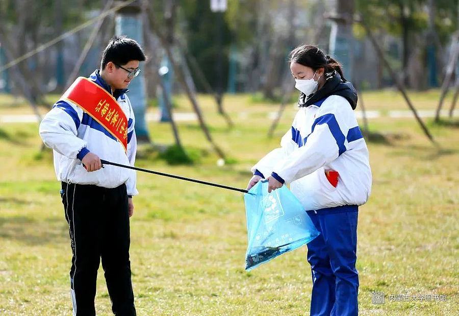 2022年3月5日,在江苏省扬州市江都区双拥公园,江都区第二中学学生在学雷锋主题活动中捡拾垃 新华社发(任飞 摄)