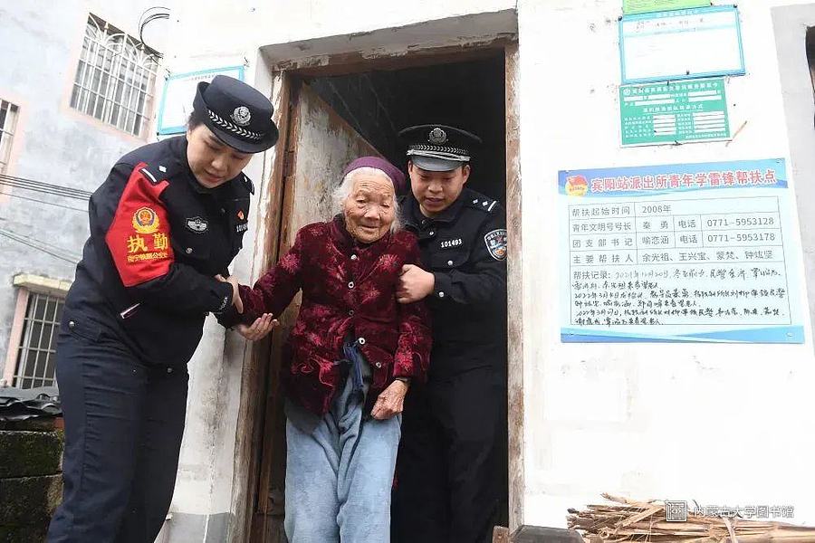 2023年2月5日,在广西宾阳县黎塘镇梁村,宾阳站派出所民警扶着黄爱明老人走出家门。