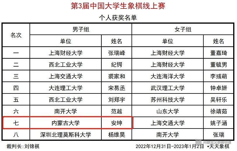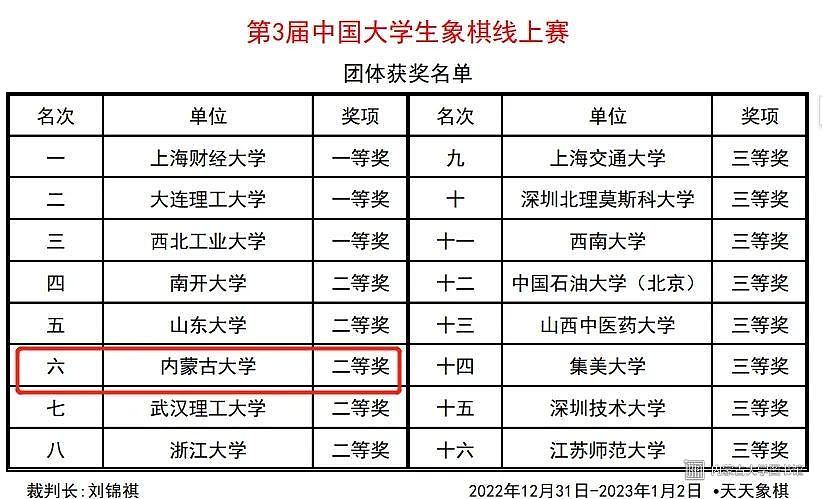 2022年12月31日—2023年1月2日,第3届中国大学生象棋线上赛在天天象棋平台上举行。我校代表队荣获全国第六名、团体二等奖的好成绩;物理科学与技术学院本科生安坤勇夺男子个人第7名,化学化工学院本科生朱骋宇获得男子个人第14名。