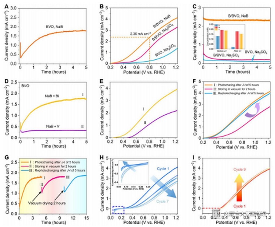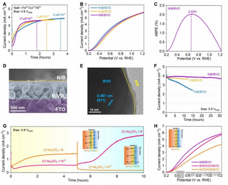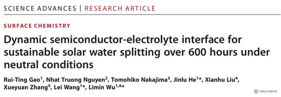 实现中性pH、温和环境下高效、稳定的光电催化(PEC)分解制氢被认为是最有希望的生产清洁可再生能源的途径之一。但中性电解质中由于较低的OH-浓度,表界面反应动力学相比于碱性电解质更加缓慢。BiVO4作为一种新型的PEC半导体材料之一正受到人们的广泛注意,但严重的光生载流子复合和光腐蚀限制了其PEC性能和稳定性。为此,我校化学化工学院、能源材料化学研究院武利民教授、王蕾教授课题组和贺进禄研究员课题组通过调控电解质组成,原位组装超薄助催化剂,控制半导体/助催化剂界面处的动态平衡,实现在无牺牲试剂下半导体高达600小时的长期耐久性。相关研究成果于1月4日在线发表在Science子刊Science Advances上。