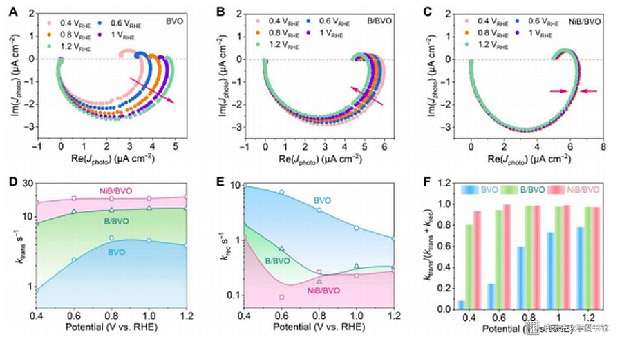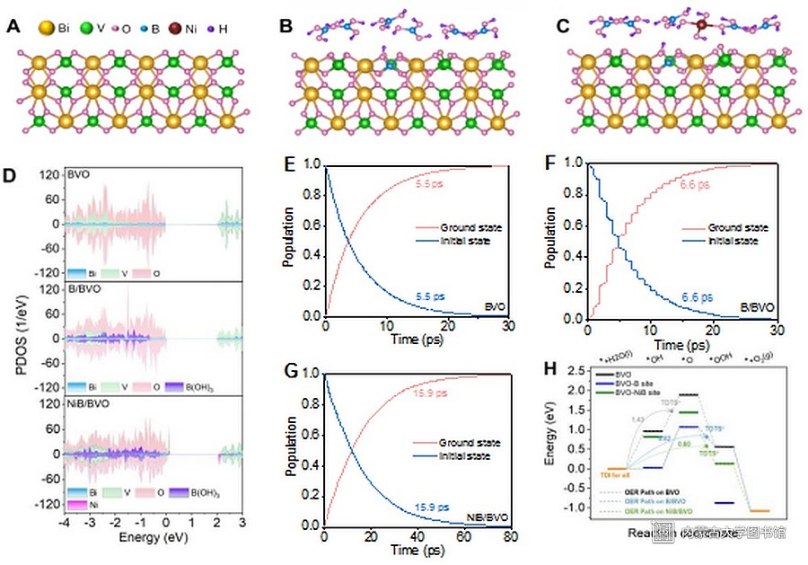团队首次通过实验证明了B原子原位取代BiVO4中V元素(图1),进一步引入Ni离子,促进B-O键的形成,提高析氧性能,获得的硼酸盐物种可以通过加速质子耦合电子转移而作为催化剂活性的促进剂(图2)。原位组装的NiB催化剂负载于BiVO4在模拟太阳光及1.23 VRHE电位下,获得6 mA cm-2的光电催化性能。更为重要的是,该NiB/BiVO4半导体达到接近600小时的光电催化抗腐蚀性能(图3),是BiVO4基光阳极在中性电解质中最好的稳定性能。IMPS、TAS动力学表征(图4)及非绝热分子动力学与时域密度泛函理论计算(图5)等证明了NiB助催化剂的负载加速了半导体光生载流子的分离与转移,缓解了半导体界面处的载流子复合,揭示半导体光生载流子寿命的延长机理。该研究可以有效推动PEC水氧化半导体/电解质动态界面的前沿发展。