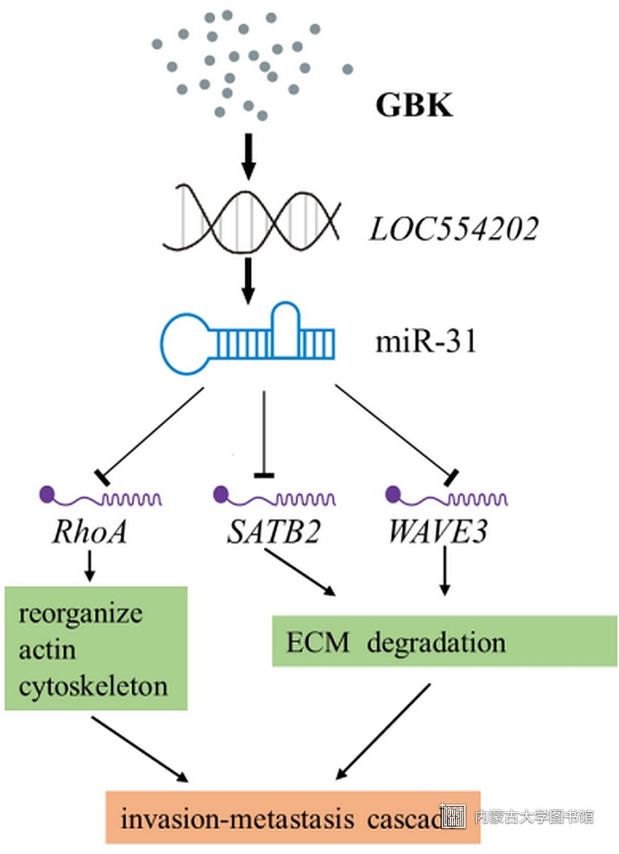 团队还发现胡椒酸钾(potassium piperate, GBK,传统蒙药荜茇提取物)能够通过上调肿瘤抑制基因miR-31的表达而抑制乳腺癌细胞迁移相关蛋白RhoA、WAVE3及SATB2的表达,进而达到抑制细胞迁移的作用。与顺铂及依托泊苷的联合用药可以促进miR-31表达上调,同时与细胞迁移密切相关的miR-31靶基因SATB2表达受到抑制。小鼠肿瘤异种移植模型证实GBK与化疗药物联合用药可以更加显著的抑制肿瘤增长。这些结果表明GBK以miR-31为作用靶点,通过促进其表达而抑制乳腺癌细胞迁移;GBK与化疗药物联合作用可增强肿瘤抑制效果,有望开发为乳腺癌临床治疗的辅助药物。该成果以题为“The antihyperlipidemic drug potassium piperonate impairs the migration and tumorigenesis of breast cancer cells via the upregulation of miR-31” 发表在Frontiers in Oncology上。博士生田晓霞和硕士生卢君萍为该文共同第一作者,范丽菲副教授为本文通讯作者。
