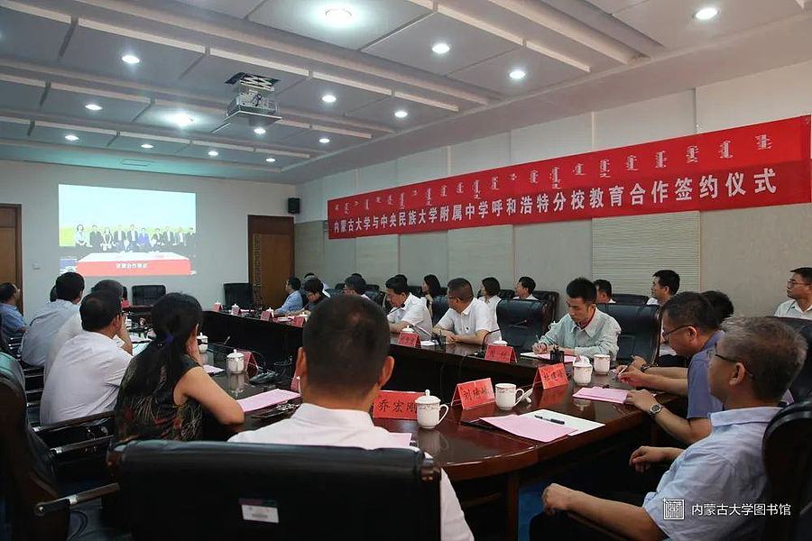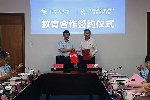 校党委副书记、校长陈国庆与中央民族大学附属中学呼和浩特分校党支部书记、校长王建学代表合作双方签署教育合作框架协议。协议约定内蒙古大学支持中央民族大学附属中学呼和浩特分校创办“青苗创新实验班”;共同实施“英才计划”项目;委派挂职科研副校长,协助附中开展科学创新教学实践项目;选派优秀师资及研究生作为兼职导师,引导附中师生开展项目式学习和研究性学习;开展“中学生走进大学实验室,大学教授走入中学课堂”等科普实践活动,统筹推进大中小学思政课一体化建设,共同落实跨学段育人,探索建立高校与中学联合发现和培养科技创新青少年后备人才的有效模式。