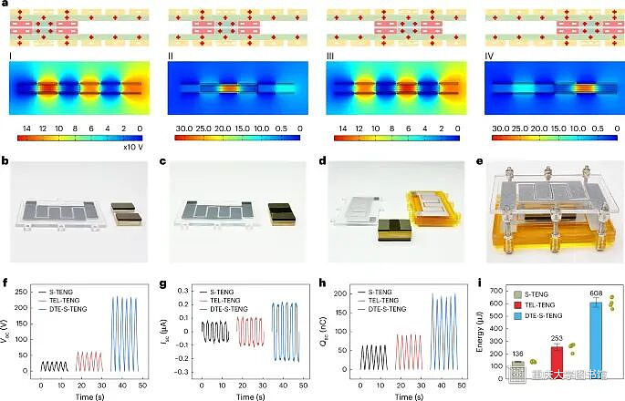 在能量层面,这项工作的关键突破来自于DTE-S-TENG的结构设计。如图3所示,研究团队将传统单层摩擦发电结构升级为“双层+三元材料”体系,使得电荷分布更加充分,能量输出显著提升。从实验数据来看(图3f–i),该结构在相同条件下可产生高达237 V的电压、0.2 μA电流以及200 nC电荷,其单次循环能量输出达到608 μJ,分别是传统结构的4.5倍和2.4倍。这意味着,仅依靠手臂自然运动,就可以提供足够能量完成信号生成与无线传输。更重要的是,这种结构通过优化材料间电荷保持能力(如PTFE表面电荷稳定性)与降低摩擦阻力,实现了高效率与舒适性兼顾。这对于可穿戴设备而言尤为关键——不仅要“能用”,还要“好用”。