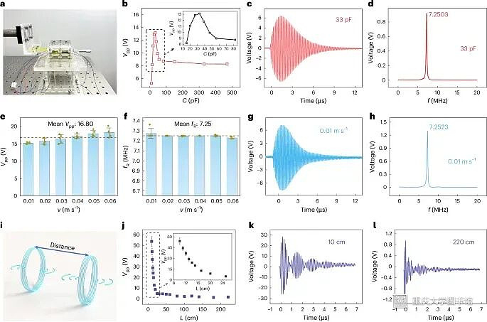 对于无线系统而言,稳定性与传输距离至关重要。图5系统评估了多种参数对信号的影响。首先是电容匹配问题。实验表明,当接收端电容为33 pF时,信号强度达到最大(图5b),对应谐振频率约7.25 MHz(图5d)。这说明系统可通过简单参数调节实现性能优化。其次是运动速度。随着滑动速度从0.01 m/s提升至0.06 m/s,输出电压略有增加,但频率几乎不变(图5e,f),说明系统对人体自然动作具有良好适应性。在传输距离方面,尽管信号在0.25 m内快速衰减,但在更远距离(最高2.2 m)仍保持清晰波形(图5k,l)。即使在存在障碍物(如人体或金属)的情况下,信号依然可被稳定检测,展现出较强抗干扰能力。