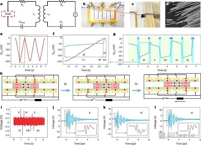 解决了能量来源问题后,下一步就是如何实现稳定的无线信号输出。图4给出了这一过程的完整机制。系统在发射端通过LC电路产生振荡电流,并通过线圈形成变化磁场;接收端通过电磁感应产生对应电信号,实现无线传输。这一过程基于强耦合磁共振(SCMR),当发射端与接收端谐振频率一致时,能量传输效率达到最大。但真正的关键在于“脉冲触发”。由于连续输出功率不足以激发振荡,研究团队引入碳纤维机械开关(图4b–d),在滑块运动过程中周期性接触导通,使电荷在81 ms内快速释放,形成高瞬时功率脉冲(图4g)。这一设计使系统无需储能元件即可实现无线信号触发。在实际测试中(图4i–l),每一次手臂动作都会产生多个清晰的无线信号脉冲,且相邻信号方向相反,这一特征还可用于提升信息编码密度,为复杂控制提供更多可能。